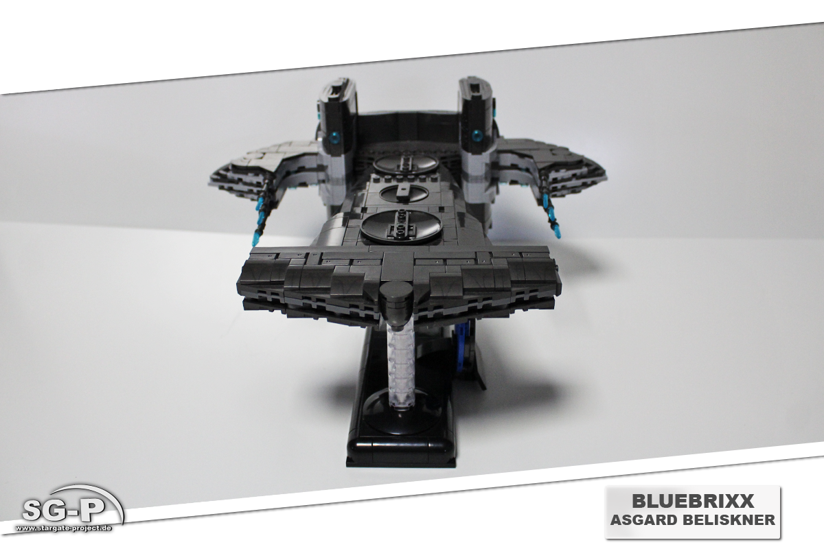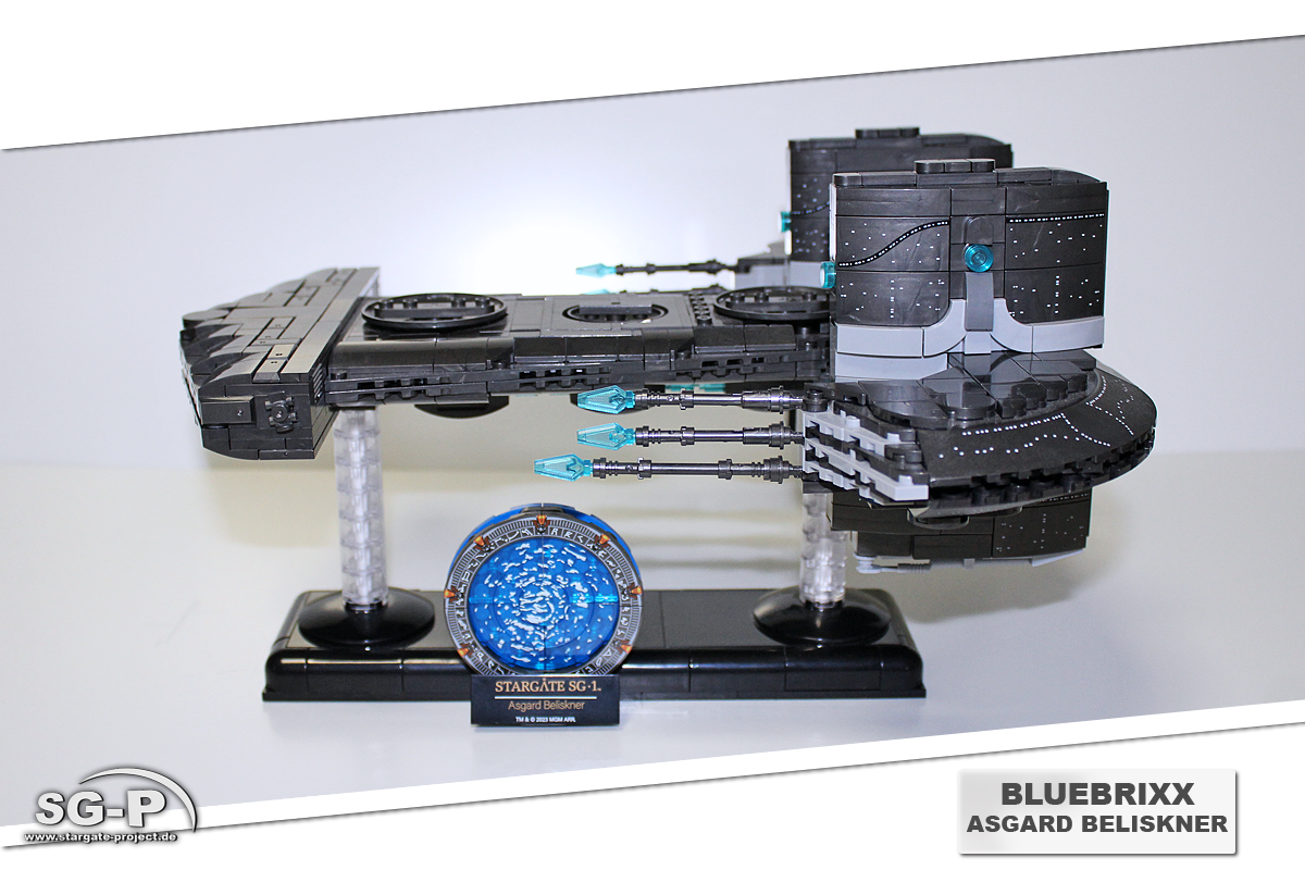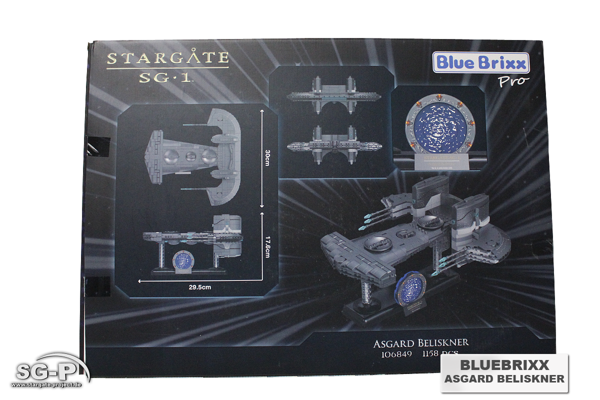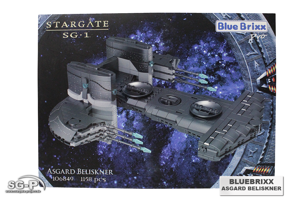 Dieser Stargate SG-1-Bausatz von BlueBrixx zeigt Thors Flaggschiff, das Asgard-Raumschiff Beliskner. Das Set mit der Nummer 106849 ist 1158 Teile stark und misst 29,5 cm in der Länge, 30 cm in der Breite und 17,6 cm in der Höhe.