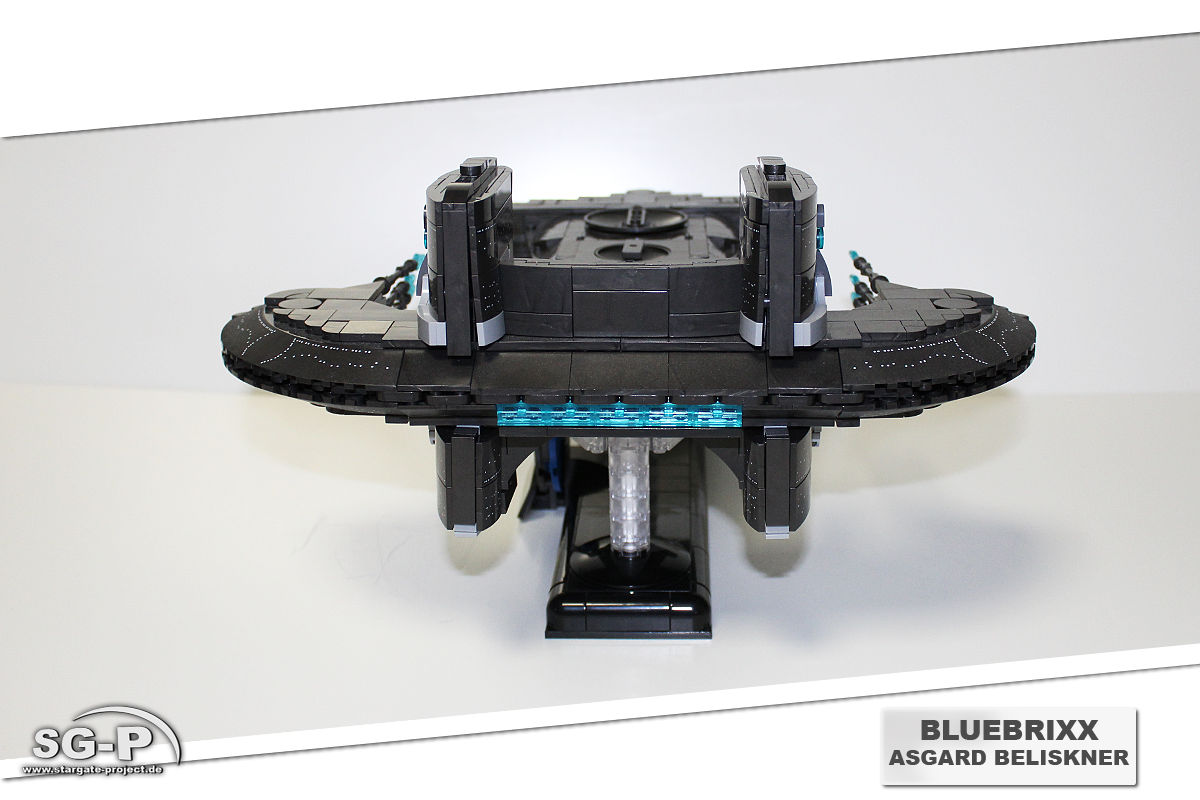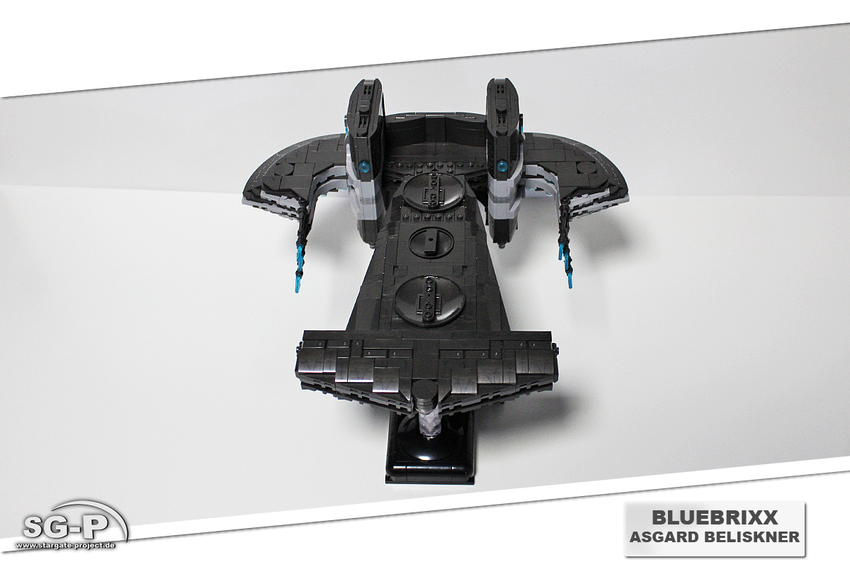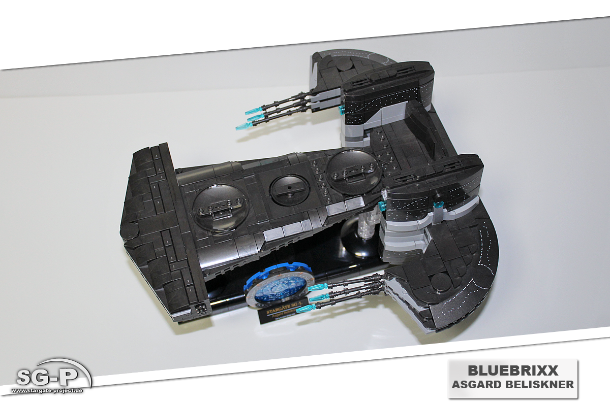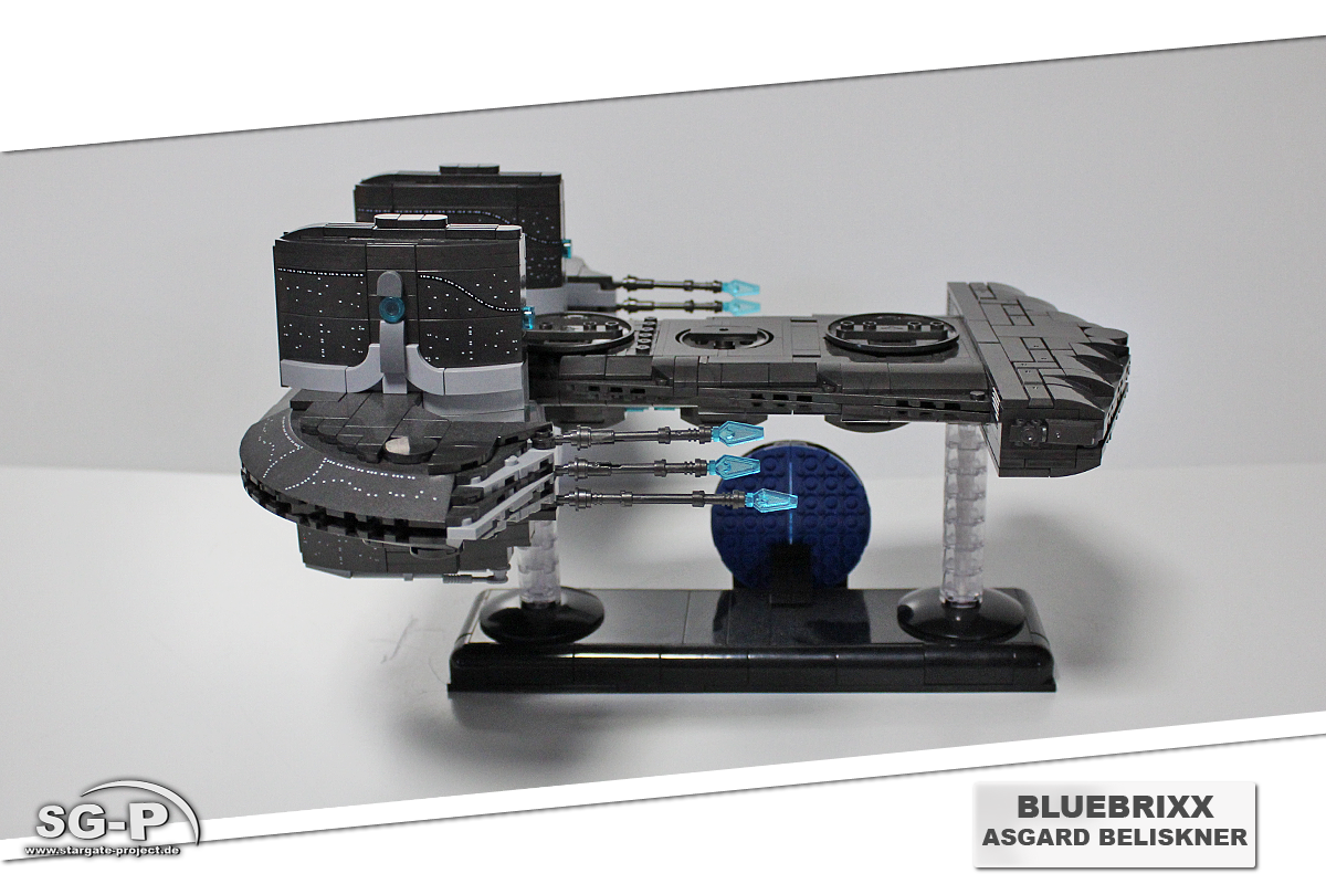 Dieser Stargate SG-1-Bausatz von BlueBrixx zeigt Thors Flaggschiff, das Asgard-Raumschiff Beliskner. Das Set mit der Nummer 106849 ist 1158 Teile stark und misst 29,5 cm in der Länge, 30 cm in der Breite und 17,6 cm in der Höhe.