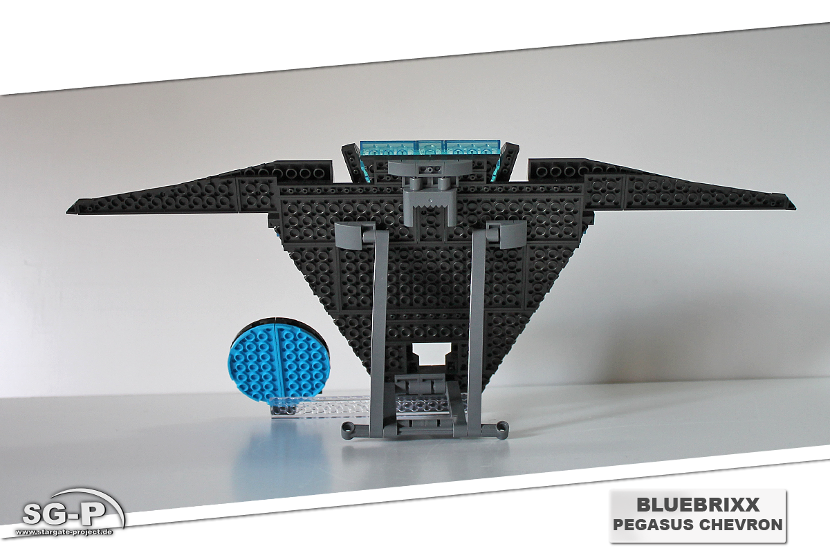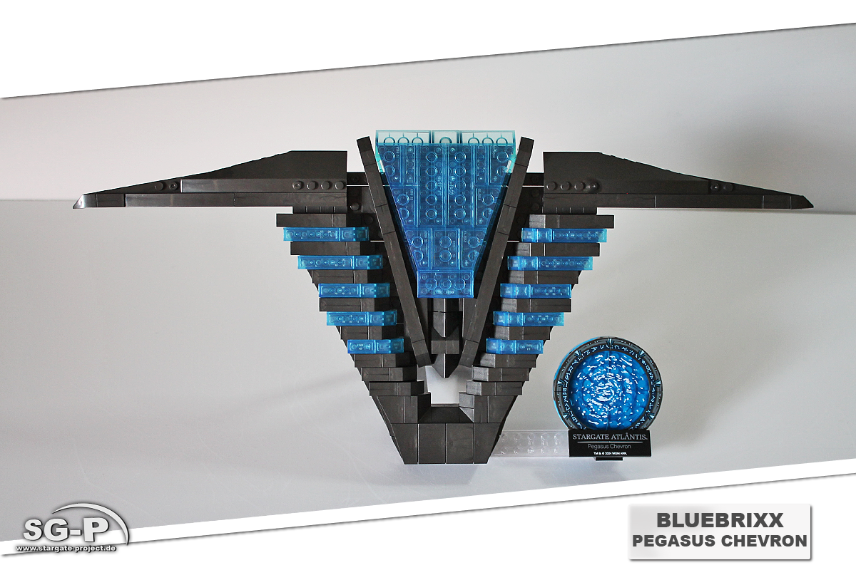 Das Modell kann entweder aufgestellt oder an die Wand gehängt werden. Mit dabei ist eine kleine Plakette in Form eines Pegasus-Gates auf der der Name des Modells aufgedruckt ist. Befestigt wird diese mit Hilfe einer langen durchsichtigen Noppenplatte. Wer die Plakette nicht am Modell haben möchte, kann sie also auch ganz einfach abnehmen.